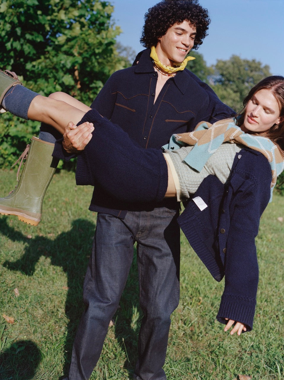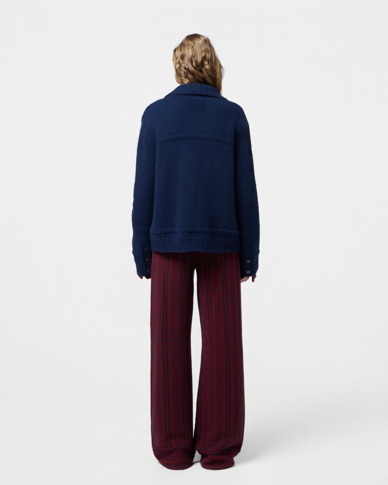 - Decorative knit braid detail across the yoke