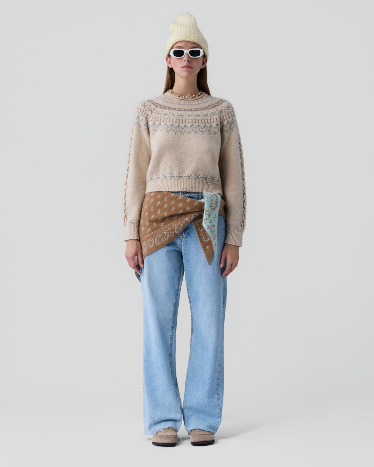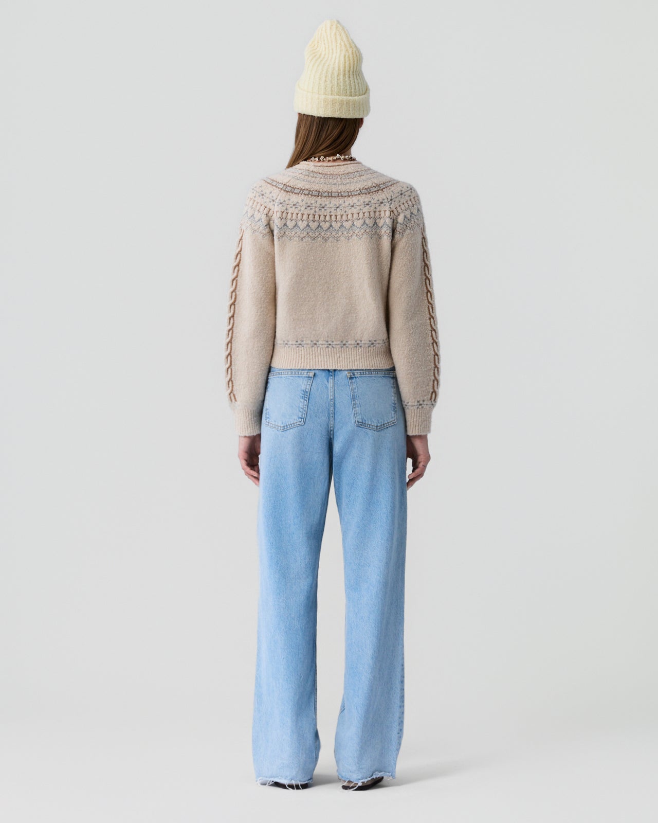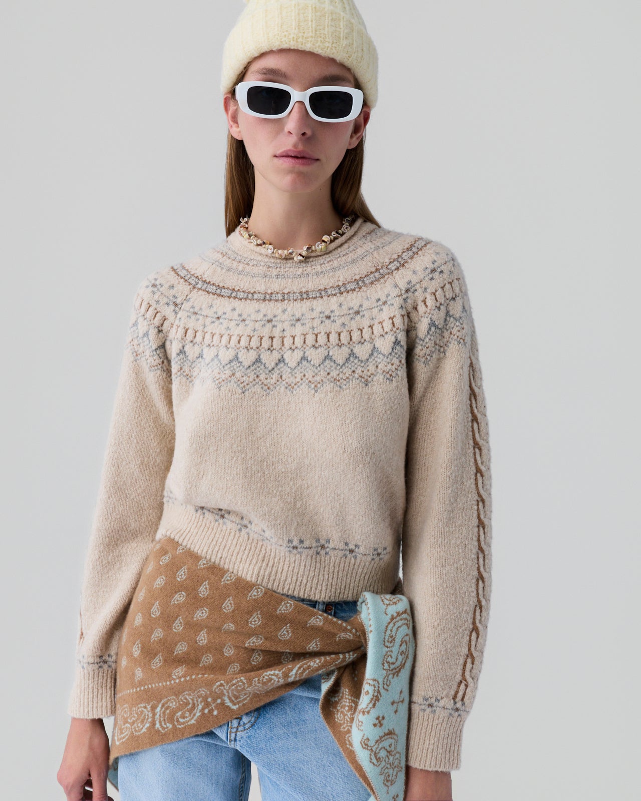 Crafted from a wool–cashmere blend and ultra-soft Cloud yarn, the Cloud Chalet Crew captures the charm of vintage alpine knits in a modern way. This women’s Fair Isle cashmere sweater has a slightly boxy silhouette that blends nostalgic patternwork with soft, cozy texture.