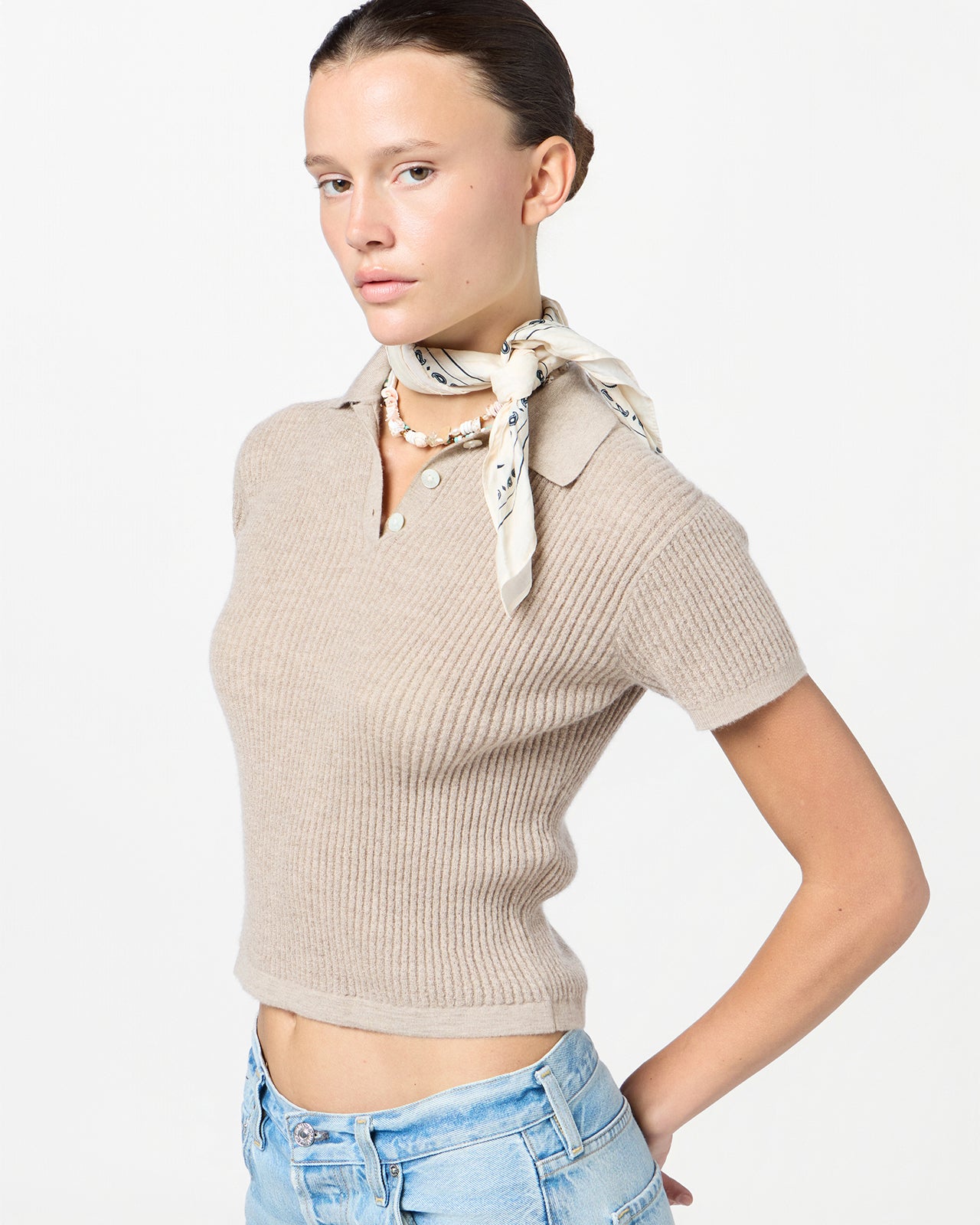 - Polo shirt collar with three-button front placket