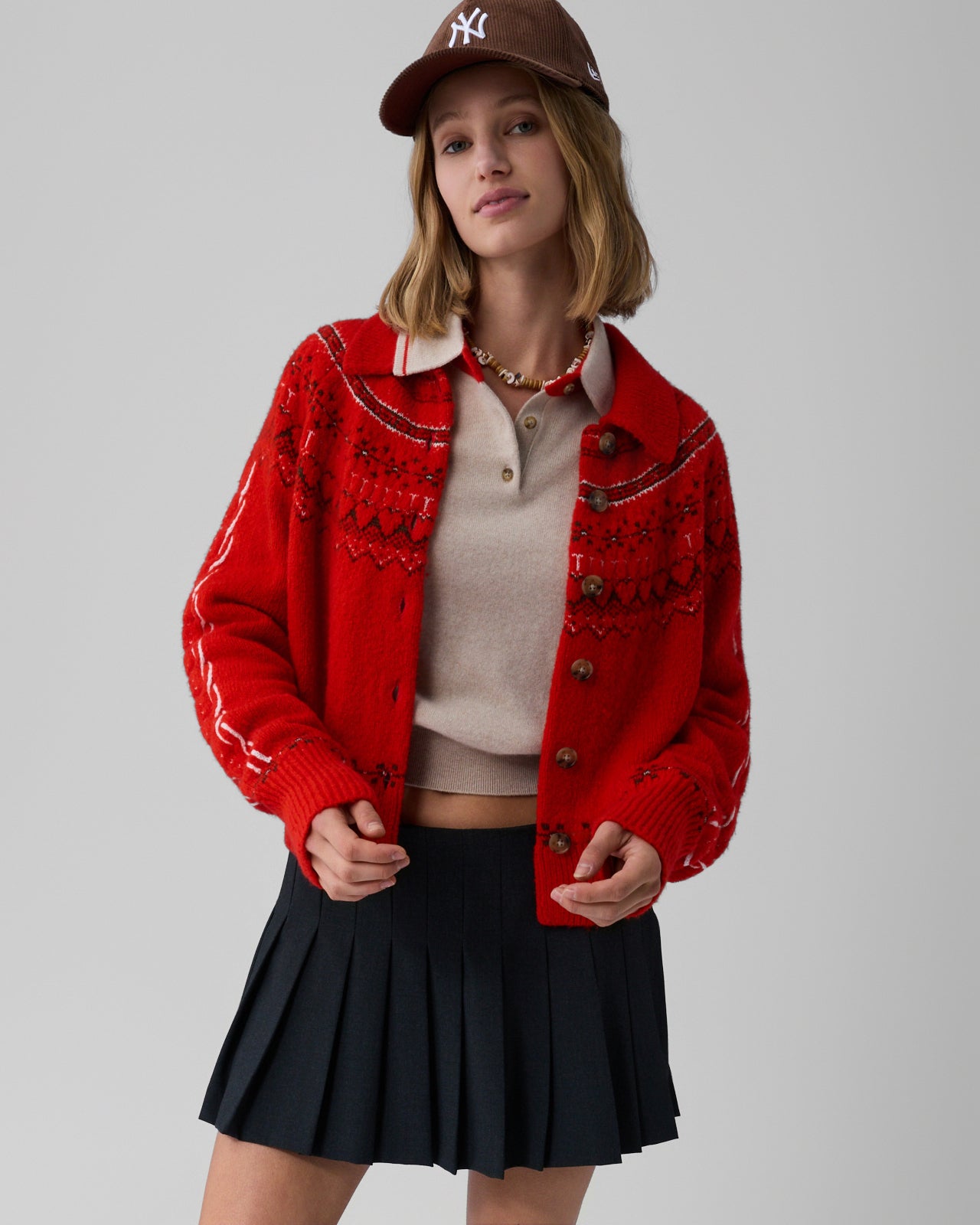 The Cloud Chalet Cardigan is a women’s Fair Isle cashmere cardigan crafted from a wool–cashmere blend and plush Cloud yarn. Designed with a relaxed, shrunken fit, it offers cozy warmth and timeless pattern — perfect for layering through the colder months.