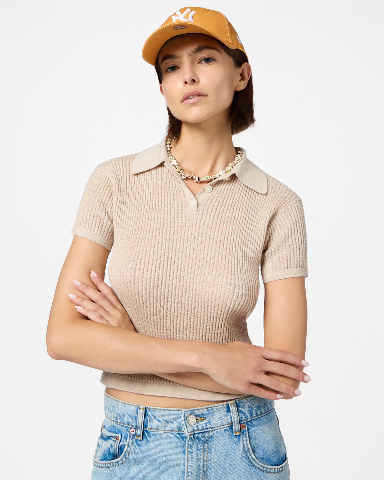 - Polo shirt collar with three-button front placket