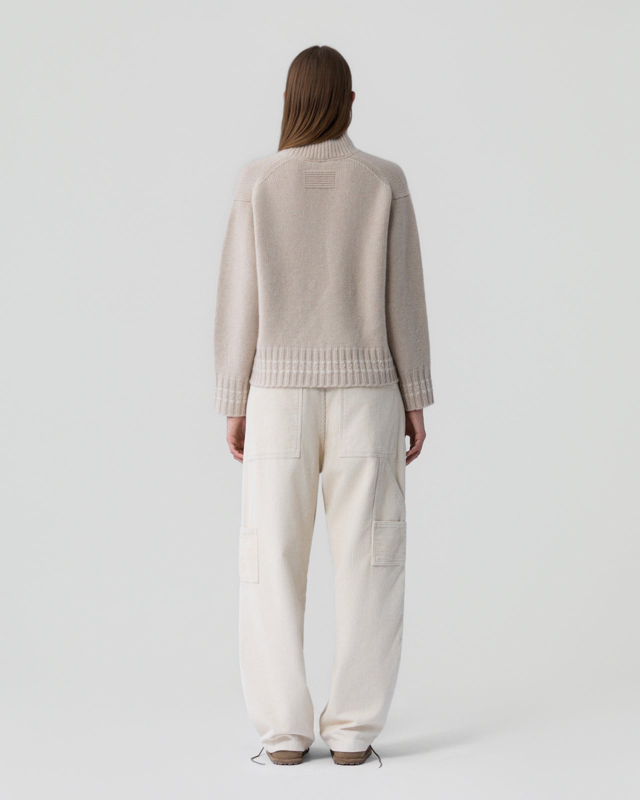• FUZZY PICK STITCH IN MERINO WOOL “CLOUD” YARN @ HEM AND SLEEVE CUFF