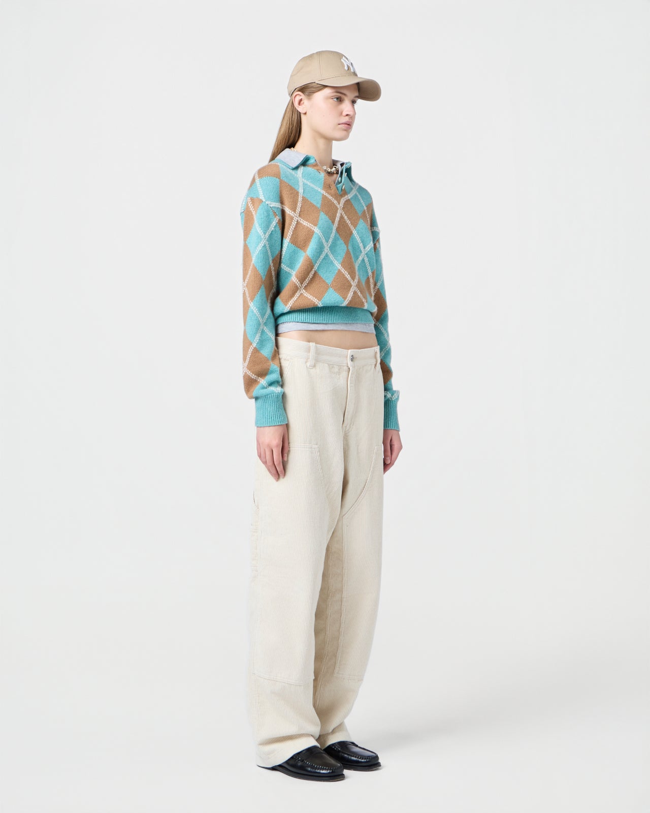 The Collegiate Argyle Polo sweater is a modern nod to preppy style. Knit from a heavy-weight wool–cashmere blend, it features bold argyle diamonds, contrast fuzzy stripes, ribbed trims, and a structured polo collar. A cashmere polo sweater designed for versatile layering.