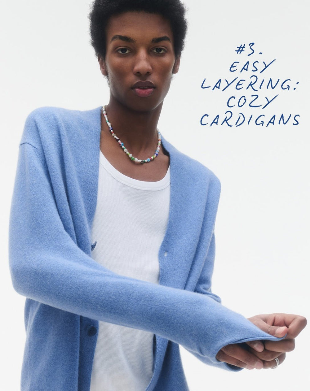 • Baja Everywear Cardigan - Powder Pink Combo with three-button closure and vertical blue and pink stripes in premium cashmere.